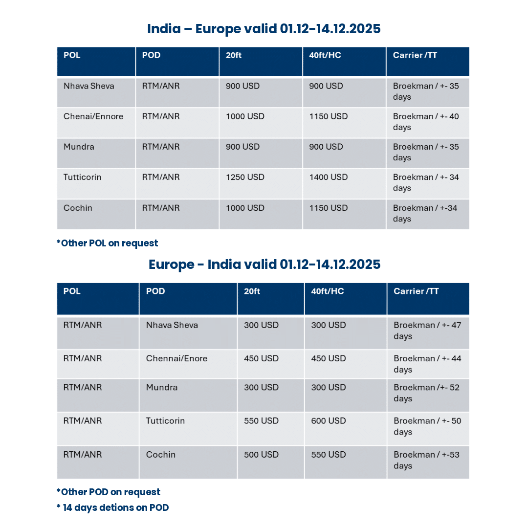 Discover our latest rate guidelines for the India–Europe and Europe–India trade lanes, valid from 1 December to 14 December 2025. Rates exclude heavy weight surcharge above 16 tonnes per 20ft container and are subject to local charges at both origin and destination.